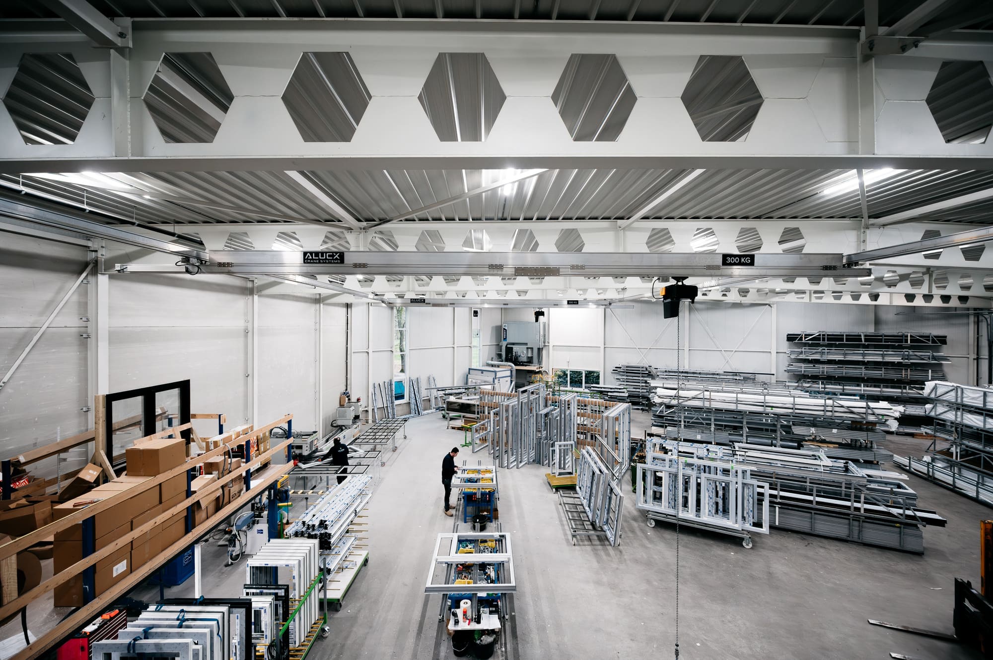 Glas- en natuursteenbedrijven werken vaak in bestaande loodsen of hallen die niet zijn gebouwd op een zwaar kraansysteem. Aluminium is daarvoor de praktische oplossing: het systeemgewicht is laag, de belasting op de dakconstructie blijft daardoor beperkt en een bouwkundige aanpassing is zelden nodig.
